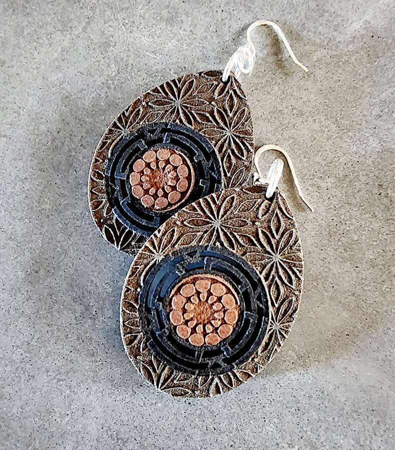 Laser-cut and engraved MDF Force Color earrings, featuring sterling silver ear fittings