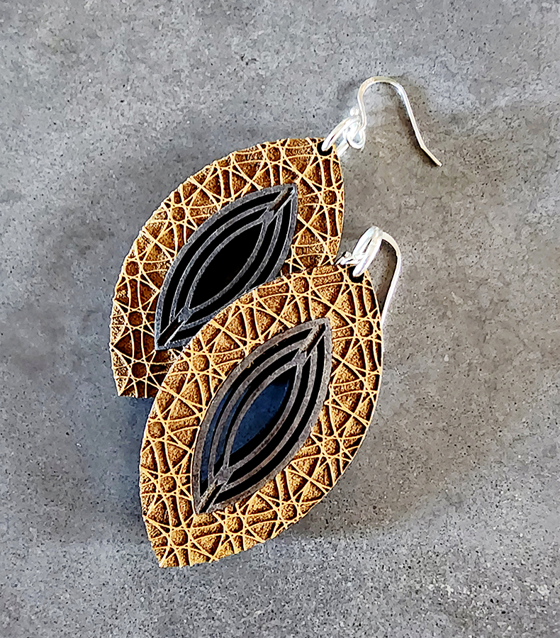 Laser-cut and engraved MDF Force Color earrings, featuring sterling silver ear fittings