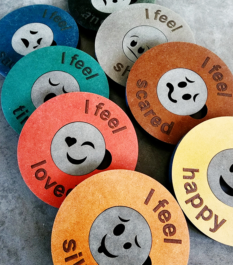 Laser-cut and engraved MDF Force Emotion matcher, Green, Blue, Yellow, Orange, Red, Grey, blown & Black
