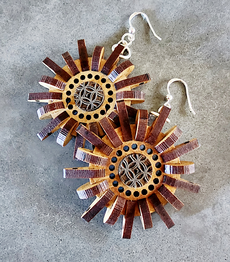 Laser-cut and engraved MDF Force Color earrings, featuring sterling silver ear fittings