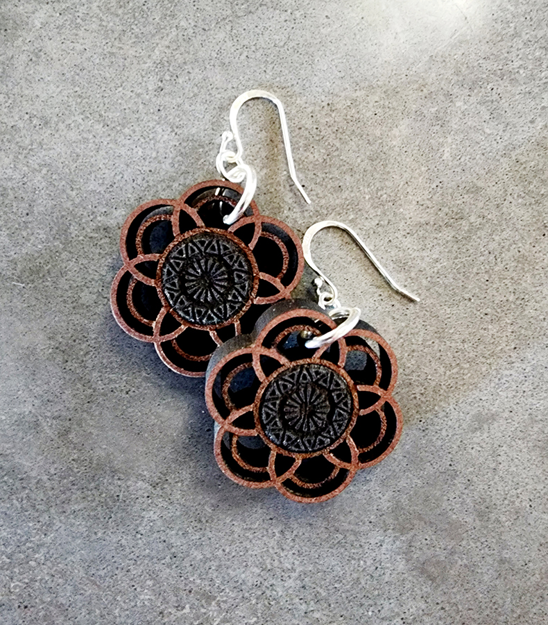 Laser-cut and engraved MDF Force Color earrings, featuring sterling silver ear fittings